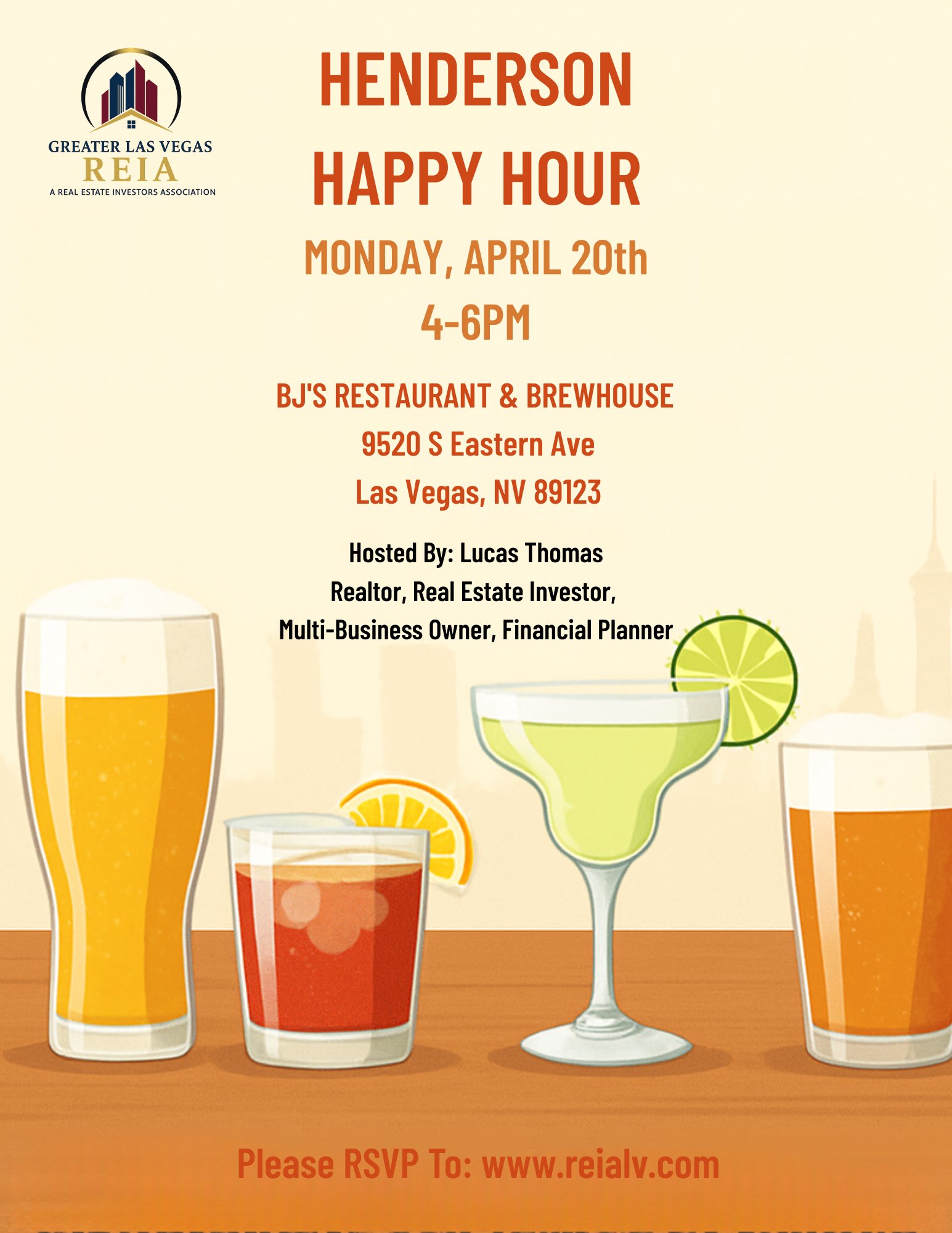 Due to popular demand, we’re bringing our meetup to Henderson! Starting this month, join us every third week of the month for a relaxed, high-value Happy Hour Meetup designed to connect, educate, and grow our local real estate and investor community—right in your neighborhood.