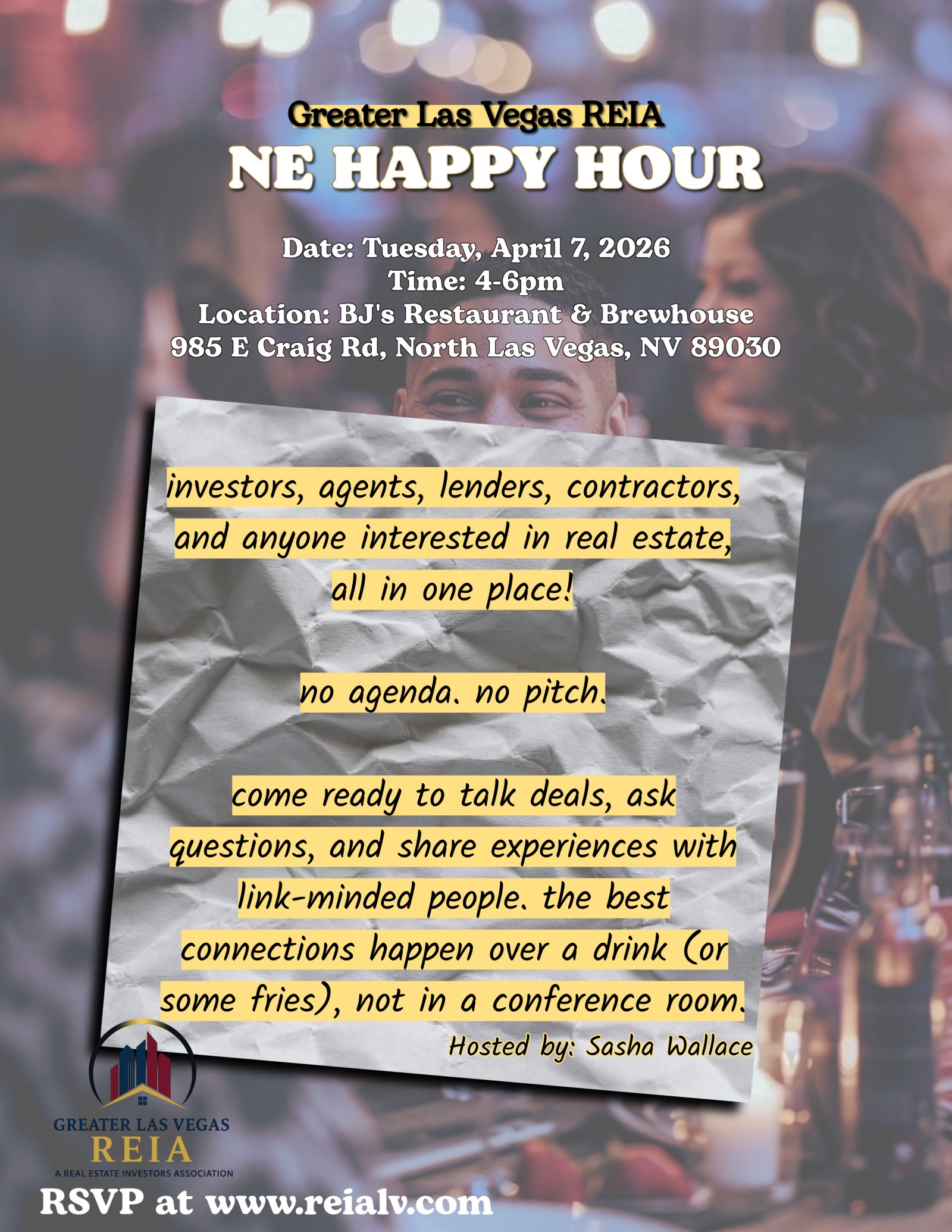 Greater Las Vegas REIA presents our newest Happy Hour in Northeast Las Vegas. This is a great opportunity to network with real estate professionals and other business professionals in the northeast area. Hosted by Sasha Wallace